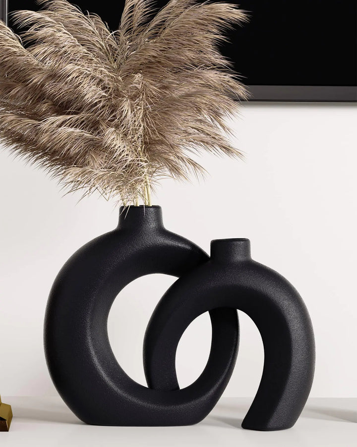 Black Vase Set of 2 - Snuggle Hollow Donut Aesthetic Ceramic Vases Home Decor Modern Nordic Minimalist Decorative Vase for Table Centerpiece Bookshelf Office Entryway Console Fireplace (Matte Black)