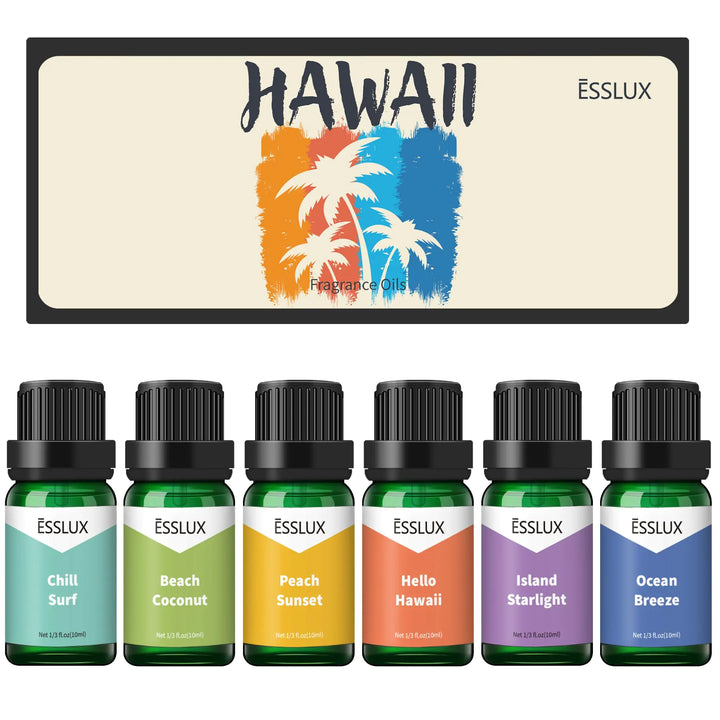 [Hawaii Fragrance Collection: Indulge in the enchanting aroma of the Hawaii Fragrance Collection meticulously curated by the skilled artisans of the ESSLUX team; immerse yourself in the essence of lush landscapes sun-kissed beaches and the gentle sway of palm trees creating an atmosphere brimming with irresistible charm and genuine tranquility 6x10 ml Fragrance Oils: Ocean Breeze Beach Coconut Chill Surf Island Starlight Peach Sunset Hello Hawaii each elegantly bottled in a convenient 10 ml size; each scent promises a captivating journey evoking the vibrant passion and serene beauty of Hawaii Soap and Candle Fragrance Oils: this Hawaii fragrance oils set captures the unique essence of Hawaii’s natural beauty ideal for enhancing scented soaps dryer balls body lotions bath bombs bath salts and perfumes; these oils are also perfect for crafting exquisite candles adding a touch of tropical paradise and allure to your handmade creations Premium Diffuser Oils: with safe and premium formula these candle scents essential oils also serve as great essential oils for humidifier diffusers in your home office and car infusing your spaces with delightful scents; or you can simply make it into room spray for an instant refresh Safe to use: all of our fragrance oils are crafted in strict adherence to IFRA guidelines and undergo rigorous testing in certified lab to guarantee top-notch quality and safety; furthermore all our fragrance essential oils do not contain phthalates or parabens making them not only safe for you but also environmentally friendly]